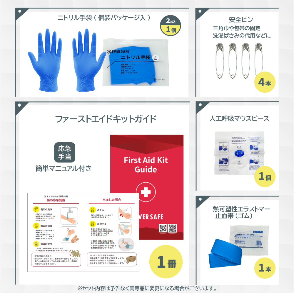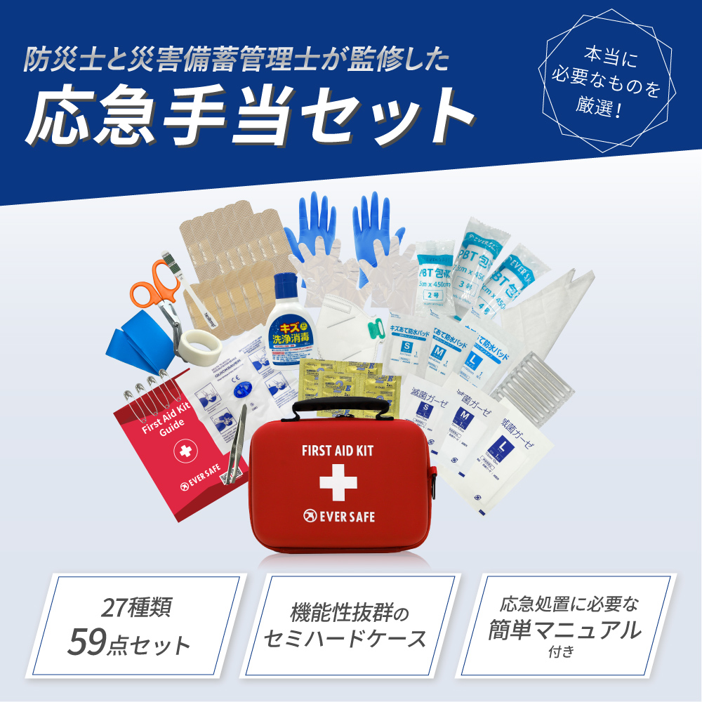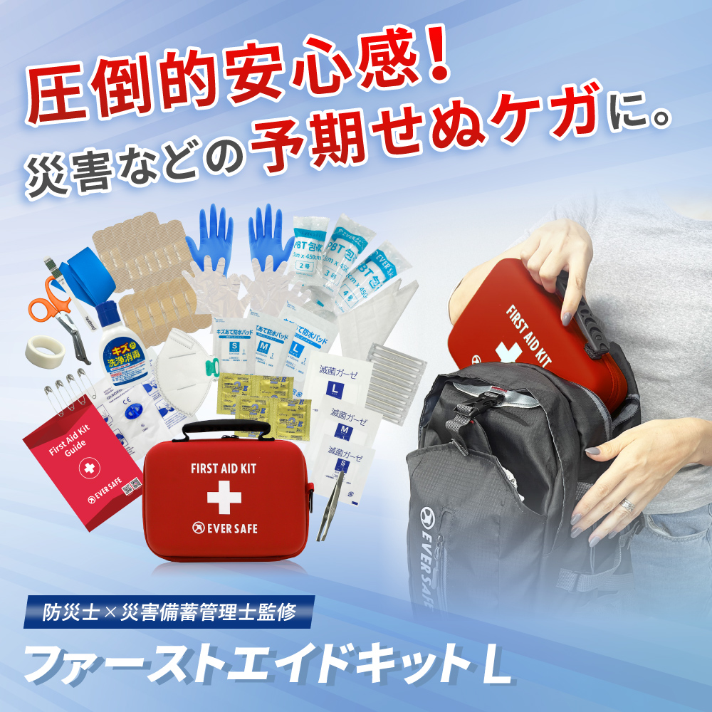 【防災士×災害備蓄管理士監修】 災害時やアウトドア、スポーツなど、いたるところに危険は潜んでいます。ですが、ご自身でひとつひとつ揃えるのは面倒で手間もかかりますよね。 そんなお悩みを解消するため、本当に必要なアイテムを厳選したファーストエイドキットを作りました。 機能性抜群なセミハードケースにすべて収納しているので、すぐに持ち出せます。 また 簡単マニュアルもついているので、いざというときにも冷静に手当が可能です。 家庭用はもちろん、キャンプなどの宿泊用、車載用にもぴったりのセットです。 ■セット内容品 ファーストエイドポーチ(Lサイズ)×1液晶体温計×1N95防護マスク×1キズ洗浄消毒×1絆創膏(Mサイズ)×12絆創膏(Lサイズ)×6キズあて防水パッド(Sサイズ)×1キズあて防水パッド(Mサイズ)×1キズあて防水パッド(Lサイズ)×1滅菌ガーゼ(Sサイズ)×1滅菌ガーゼ(Mサイズ)×1滅菌ガーゼ(Lサイズ)×1アルコール消毒綿×4ハサミ×1ピンセット×1包帯(2号)×1包帯(3号)×1包帯(4号)×1不織布三角巾×1綿棒(個包装)×10ニトリル手袋(個装パッケージ入)×1ポリエチレン手袋(密封個包装)×2不織布テープ×1安全ピン×4止血帯(ゴム)×1人工呼吸マウスピース×1ファーストエイドキットガイド×1