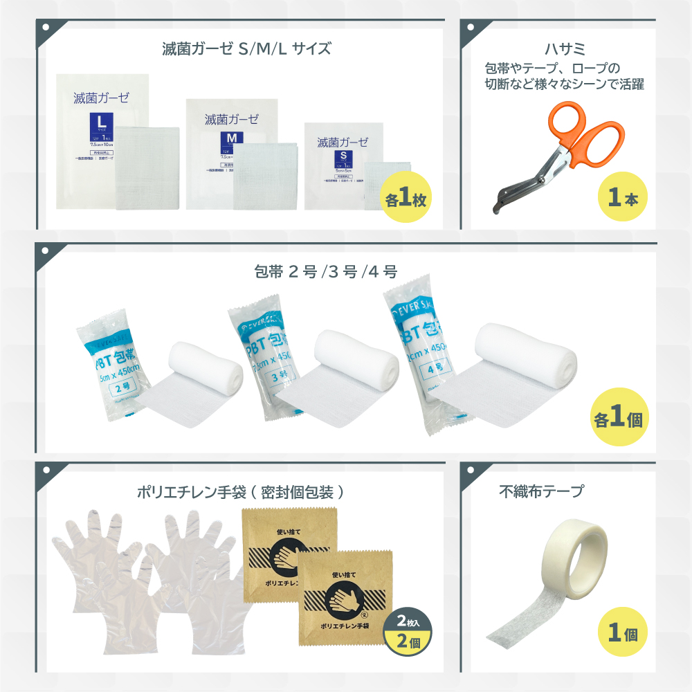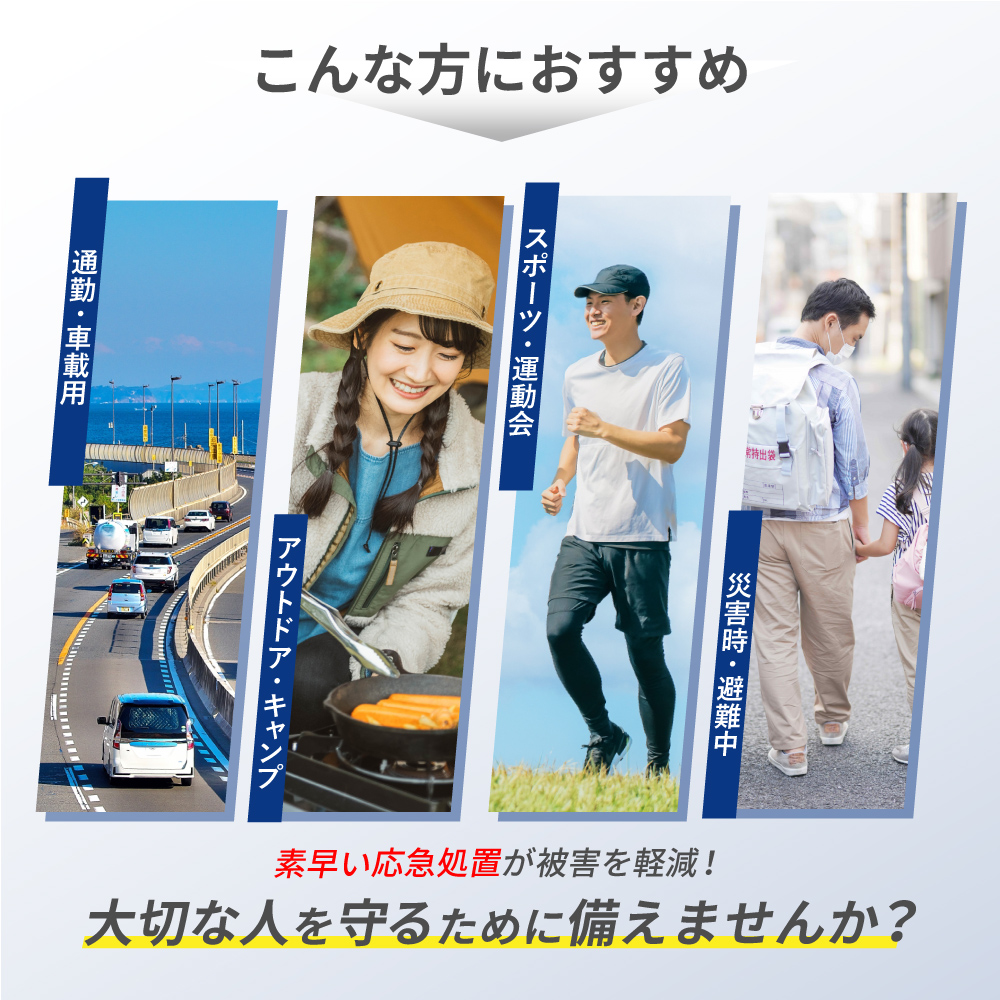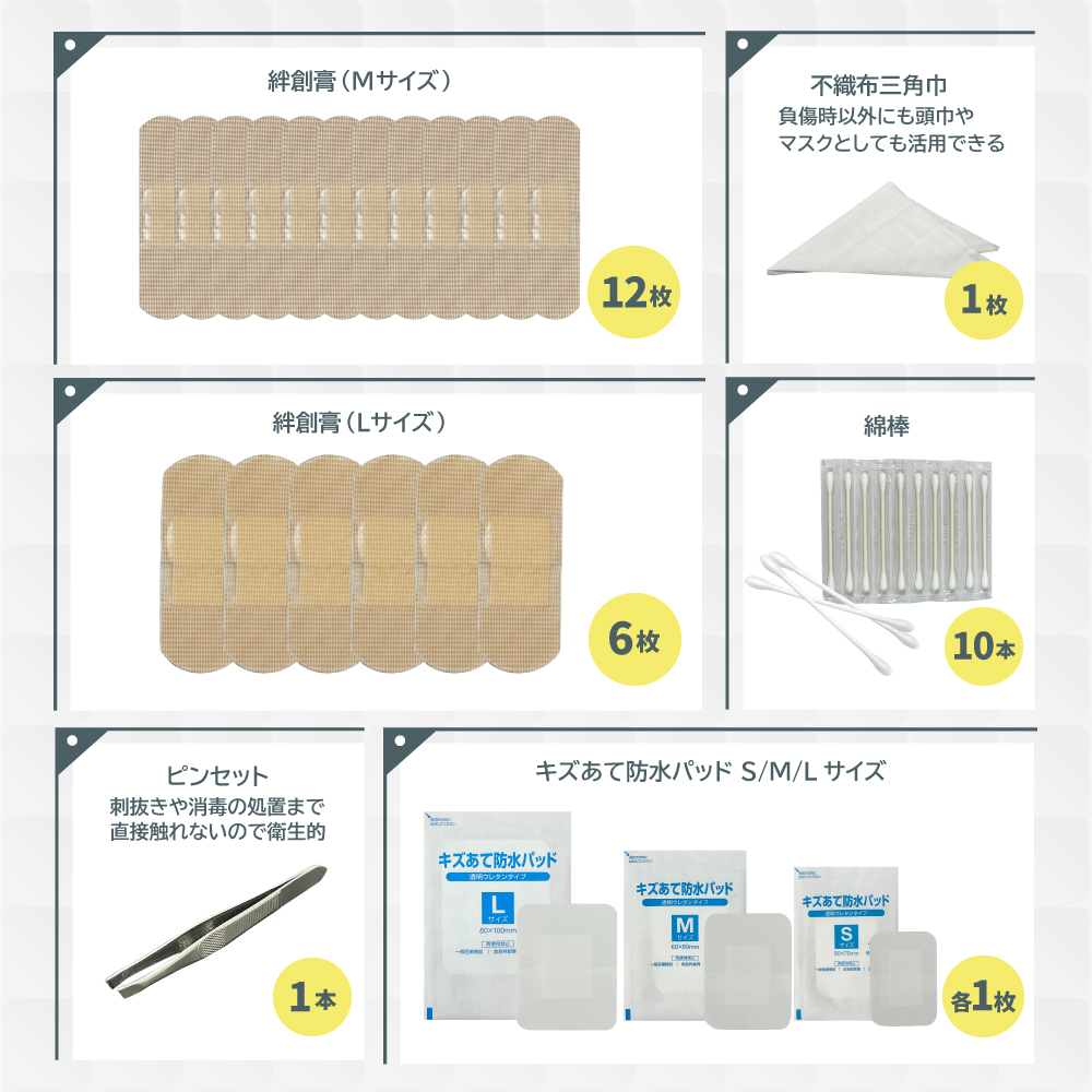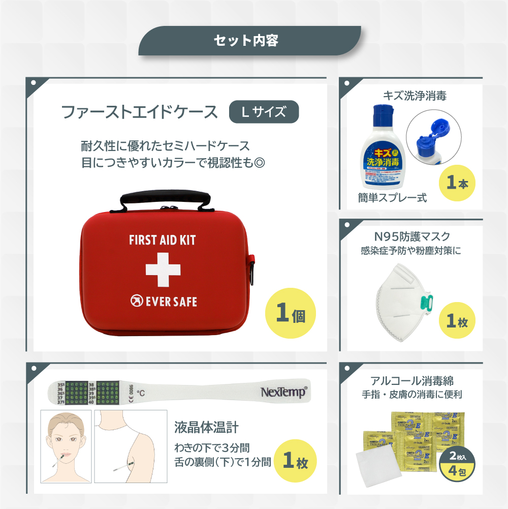 【防災士×災害備蓄管理士監修】 災害時やアウトドア、スポーツなど、いたるところに危険は潜んでいます。ですが、ご自身でひとつひとつ揃えるのは面倒で手間もかかりますよね。 そんなお悩みを解消するため、本当に必要なアイテムを厳選したファーストエイドキットを作りました。 機能性抜群なセミハードケースにすべて収納しているので、すぐに持ち出せます。 また 簡単マニュアルもついているので、いざというときにも冷静に手当が可能です。 家庭用はもちろん、キャンプなどの宿泊用、車載用にもぴったりのセットです。 ■セット内容品 ファーストエイドポーチ(Lサイズ)×1液晶体温計×1N95防護マスク×1キズ洗浄消毒×1絆創膏(Mサイズ)×12絆創膏(Lサイズ)×6キズあて防水パッド(Sサイズ)×1キズあて防水パッド(Mサイズ)×1キズあて防水パッド(Lサイズ)×1滅菌ガーゼ(Sサイズ)×1滅菌ガーゼ(Mサイズ)×1滅菌ガーゼ(Lサイズ)×1アルコール消毒綿×4ハサミ×1ピンセット×1包帯(2号)×1包帯(3号)×1包帯(4号)×1不織布三角巾×1綿棒(個包装)×10ニトリル手袋(個装パッケージ入)×1ポリエチレン手袋(密封個包装)×2不織布テープ×1安全ピン×4止血帯(ゴム)×1人工呼吸マウスピース×1ファーストエイドキットガイド×1
