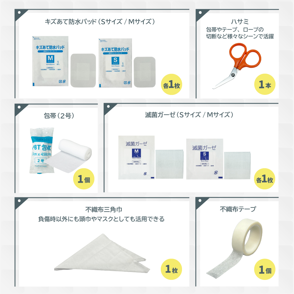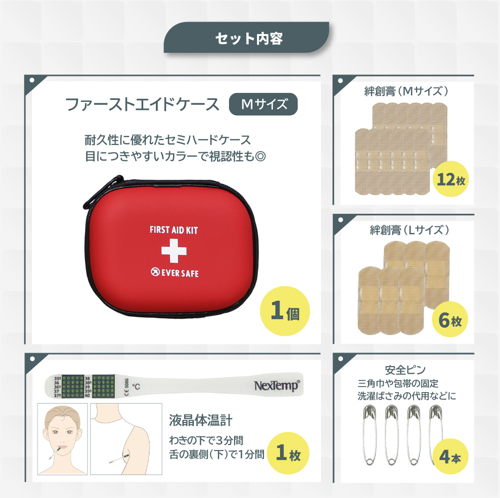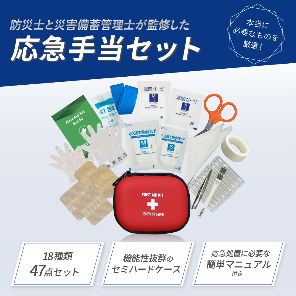【防災士×災害備蓄管理士監修】 災害時やアウトドア、スポーツなど、いたるところに危険は潜んでいます。ですが、ご自身でひとつひとつ揃えるのは面倒で手間もかかりますよね。 そんなお悩みを解消するため、本当に必要なアイテムを厳選したファーストエイドキットを作りました。 機能性抜群なセミハードケースにすべて収納しているので、すぐに持ち出せます。 また 簡単マニュアルもついているので、いざというときにも冷静に手当が可能です。 家庭用はもちろん、キャンプなどの宿泊用、車載用にもぴったりのセットです。 ■セット内容品 ファーストエイドポーチ(Mサイズ)×1液晶体温計×1絆創膏(Mサイズ)×12絆創膏(Lサイズ)×6キズあて防水パッド(Sサイズ)×1キズあて防水パッド(Mサイズ)×1滅菌ガーゼ(Sサイズ)×1滅菌ガーゼ(Mサイズ)×1ハサミ×1ピンセット×1包帯(2号)×1不織布三角巾×1綿棒(個包装)×10ポリエチレン手袋(密封個包装)×2不織布テープ×1安全ピン×4止血帯(ゴム)×1ファーストエイドキットガイド×1