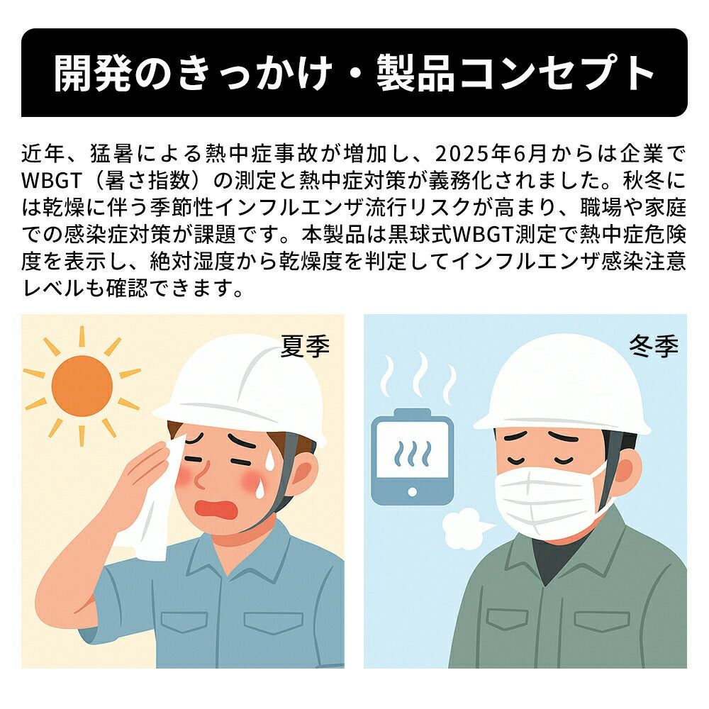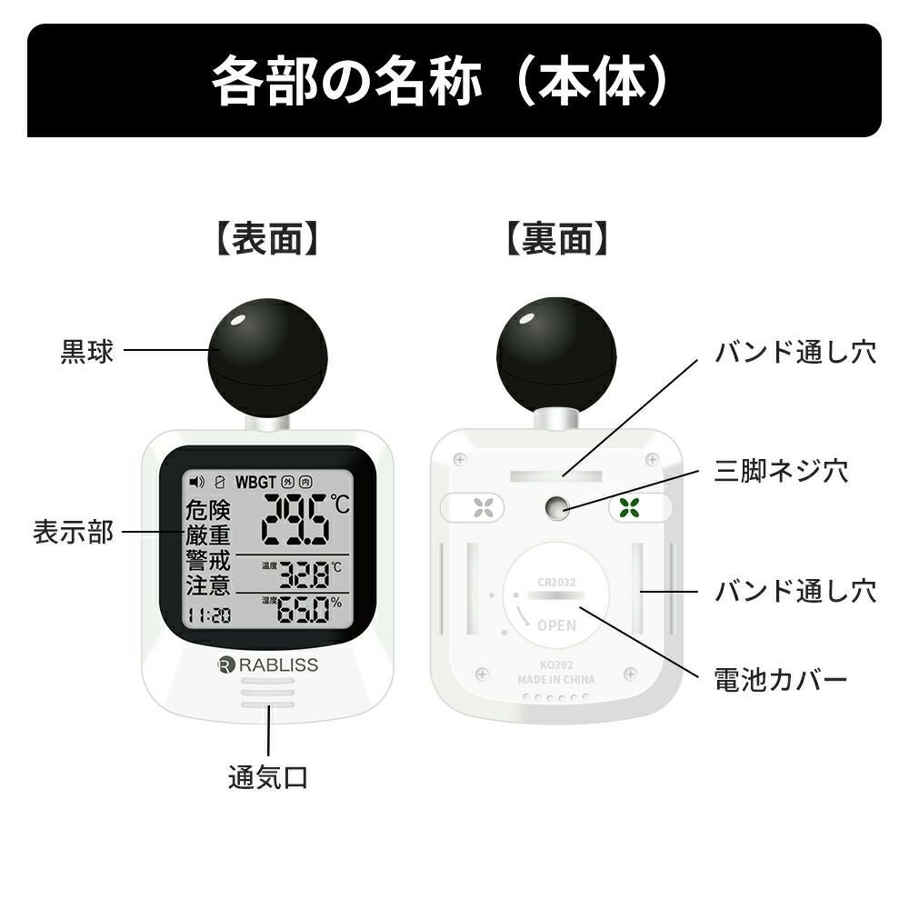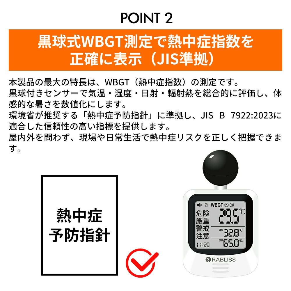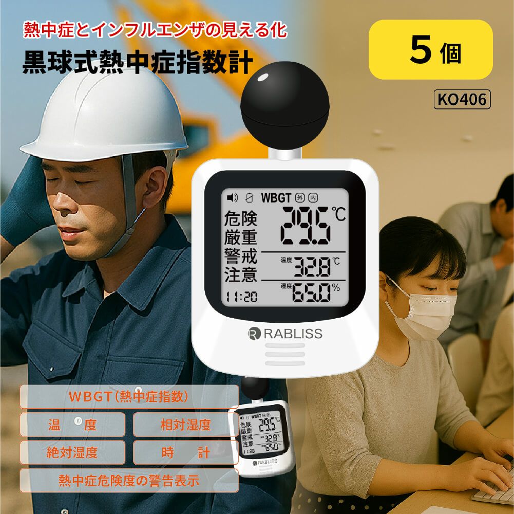 他の画像を見る 黒球式WBGT計で熱中症リスクを可視化、絶対湿度でインフルエンザ注意をお知らせ。 熱中症対策 黒球式熱中症指数計 2個 インフルエンザ注意機能 感染症対策 絶対湿度 WBGT 黒球式 JIS準拠 IP65 防塵防水 KO406 RABLISS 公式サイト特別価格 ¥ 10,241 税込 詳細を見る お気に入りに登録する