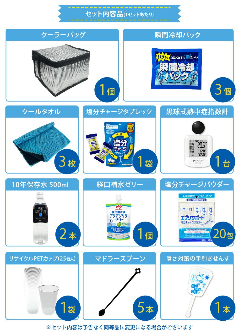 他の画像を見る 暑さ対策 熱中対策応急セット・熱中症対予防キット 夏場の現場作業 工場 スポーツ アウトドア 塩分補給 車載用にも 熱中症対策用品 熱中症対策キットDX17点 シルバー 1セット 暑さ対策 クーラーバッグ 瞬間冷却剤 ゼリー ドリンク 塩分チャージ タブレット 工事現場 ATDX001 PEACEUP 公式サイト販売価格 ¥ 3,979 税込 詳細を見る お気に入りに登録する