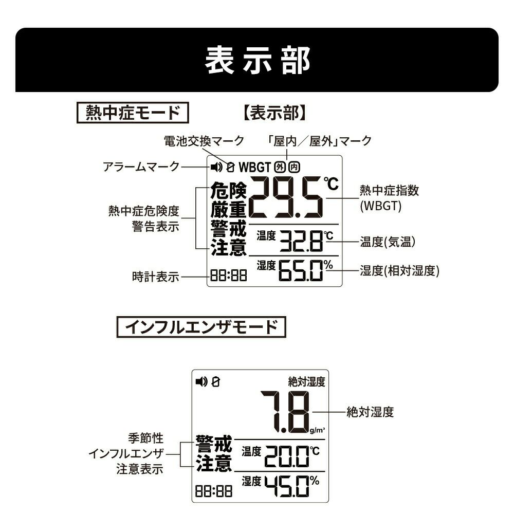 他の画像を見る 黒球式WBGT計で熱中症リスクを可視化、絶対湿度でインフルエンザ注意をお知らせ。 熱中症対策 黒球式熱中症指数計 10個 インフルエンザ注意機能 感染症対策 絶対湿度 WBGT 黒球式 JIS準拠 IP65 防塵防水 KO406 RABLISS 公式サイト販売価格 ¥ 47,025 税込 詳細を見る お気に入りに登録する