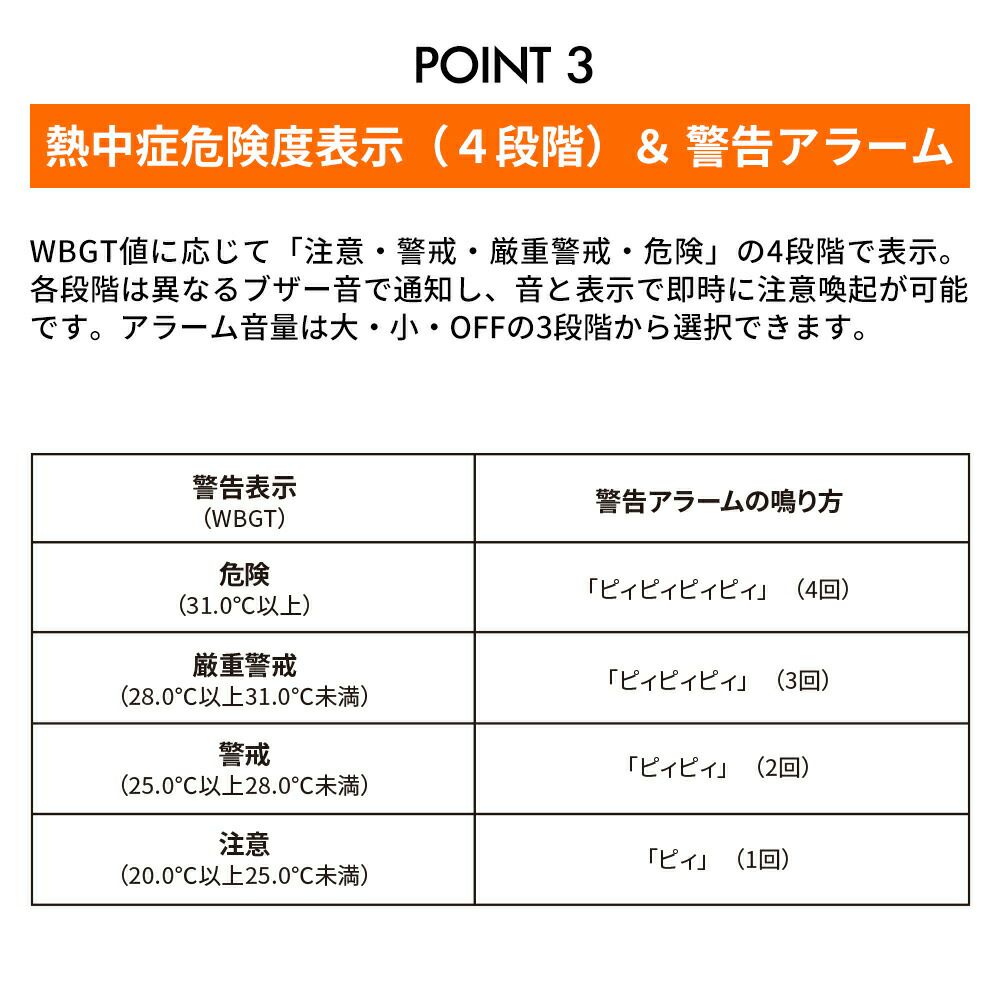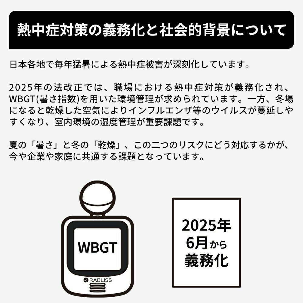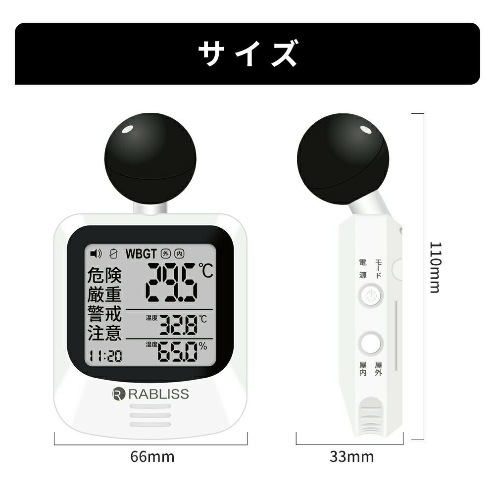 他の画像を見る 黒球式WBGT計で熱中症リスクを可視化、絶対湿度でインフルエンザ注意をお知らせ。 熱中症対策 黒球式熱中症指数計 1個 インフルエンザ注意機能 感染症対策 絶対湿度 WBGT 黒球式 JIS準拠 IP65 防塵防水 KO406 RABLISS 公式サイト販売価格 ¥ 5,500 税込 詳細を見る お気に入りに登録する