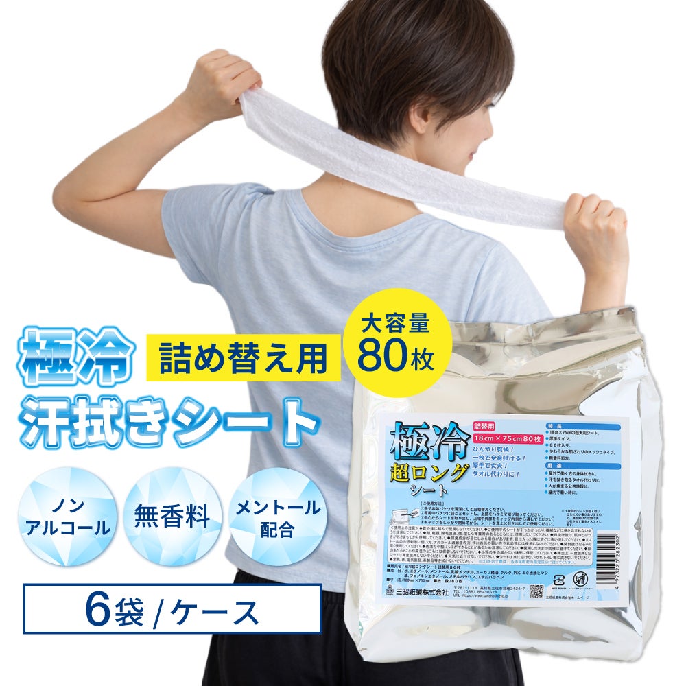 汗拭きシート 極冷 超ロングシート 詰め替え用 6袋 冷感タオル 熱中症対策 使い捨て 大容量 80枚入り 大判 無香料 ノンアルコール パウダー配合 メントール配合 PEACEUP