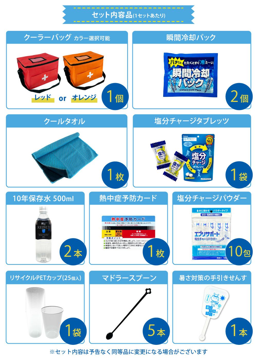 他の画像を見る 暑さ対策 熱中対策セット 熱中症予防キット 夏場の現場作業 工場 スポーツ アウトドア 熱中症対策セット 塩分補給 車載用にも 熱中症対策用品 熱中症対策キット 9点 10セット 暑さ対策 クーラーバッグ 瞬間冷却剤 ゼリー ドリンク 塩分チャージ タブレット 工事現場 ATB010 PEACEUP 公式サイト販売価格 ¥ 26,125 税込 詳細を見る お気に入りに登録する