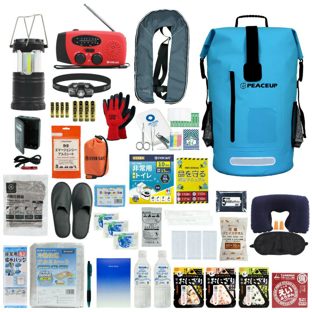 防災士監修 防災セット 1人用 ドライバッグ 防水リュック 手動膨張式 ライフジャケット ヘッドライト 水害対策 防災リュック 非常食 保存水 防災ラジオ 簡易トイレ 懐中電灯 警戒レベル4 水難 アウトドア L4DRLF01