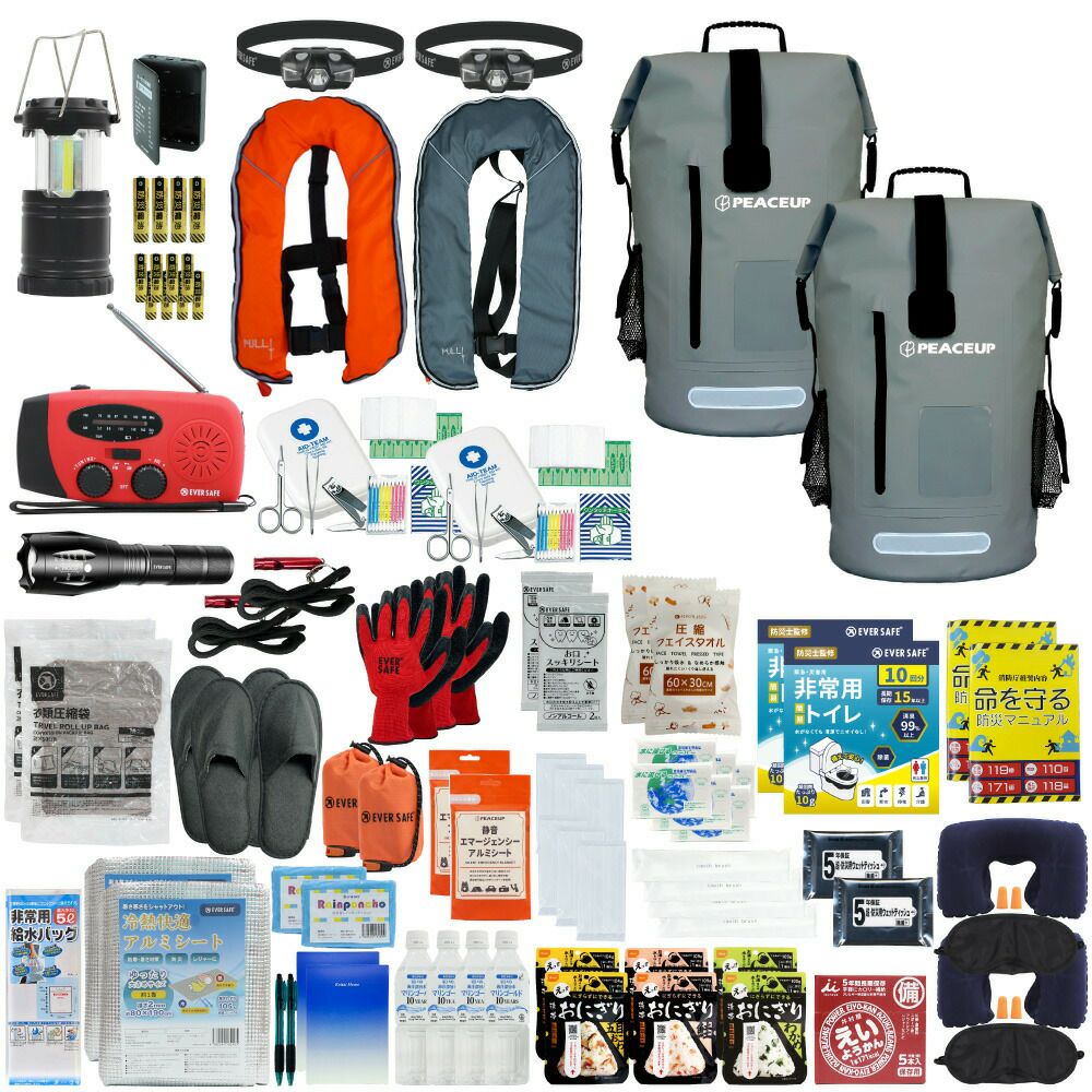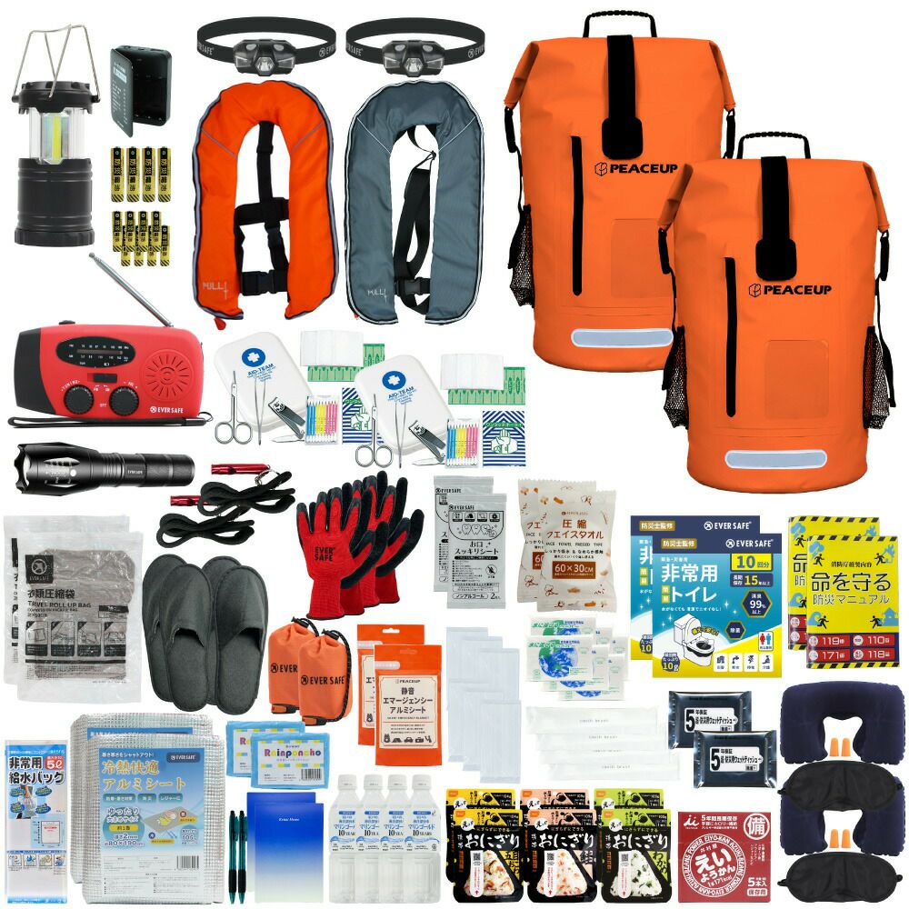 防災士監修 防災セット 2人用 ドライバッグ 防水リュック 手動膨張式 ライフジャケット ヘッドライト 水害対策 防災リュック 非常食 保存水 防災ラジオ 簡易トイレ 懐中電灯 警戒レベル4 水難 アウトドア L4DRLF02
