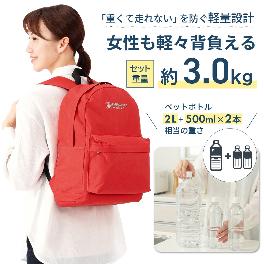 母の日父の日プレゼントとして購入しました。 何かあった時に必要なのは分かっていても自分ではなかなか準備しない防災グッズなので、喜んでもらえました。 子供のランドセルよりは軽い重さで、年配の方でも、いざと言う時に逃げるには丁度良い重さでした。 食事は大事なので、こちらで1つ追加し入れましたが、まだまだ入る余裕があるので都度チェックしながら準備してもらおうと思います。