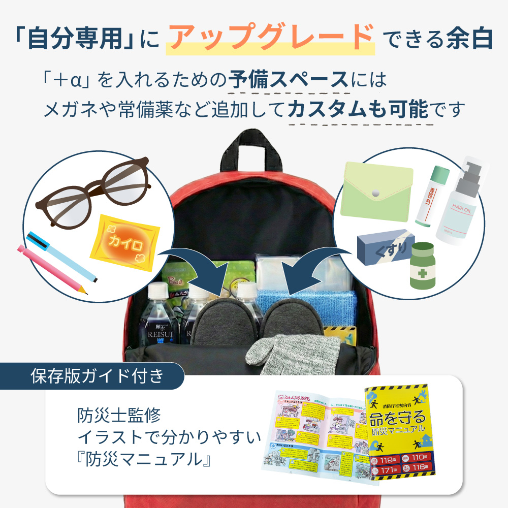 必要なものが入っていてリュックも余裕があるのでまだプラスして入れることができるので良いです お水も10年保存なのがよかったです