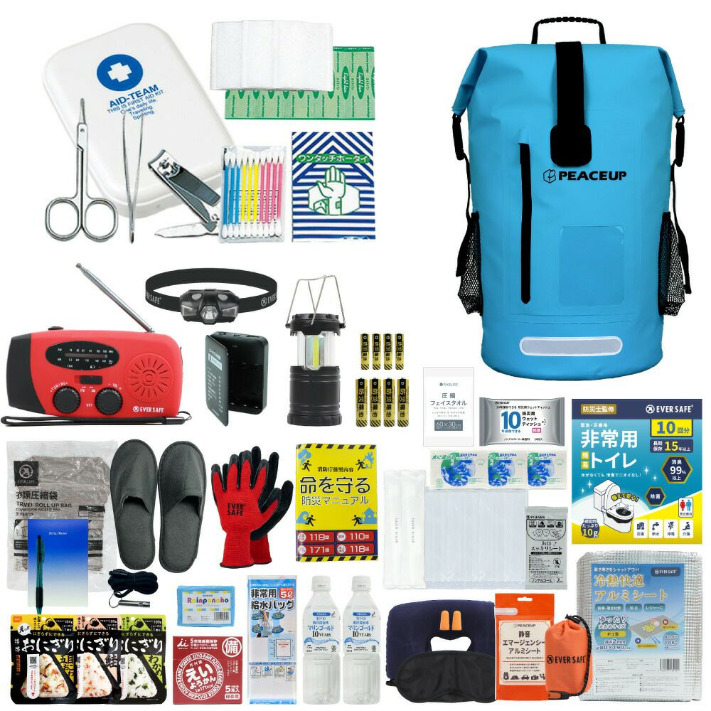 他の画像を見る 停電、断水、避難所生活などあらゆる場面を想定した万能タイプの防災セットに加え、ファーストエイドキットも付いたワンランク上の防災セット 防災グッズ 防災セット 1人用 ドライバッグ 防水リュック ヘッドライト付き 防災士監修 ファーストエイドキット トイレ 非常食 避難グッズ 水害対策 ランタン ラジオ 長期保存水 懐中電灯 警戒レベル5 EVERSAFE L5DR01 公式サイト特別価格 ¥ 21,660 税込 詳細を見る お気に入りに登録する