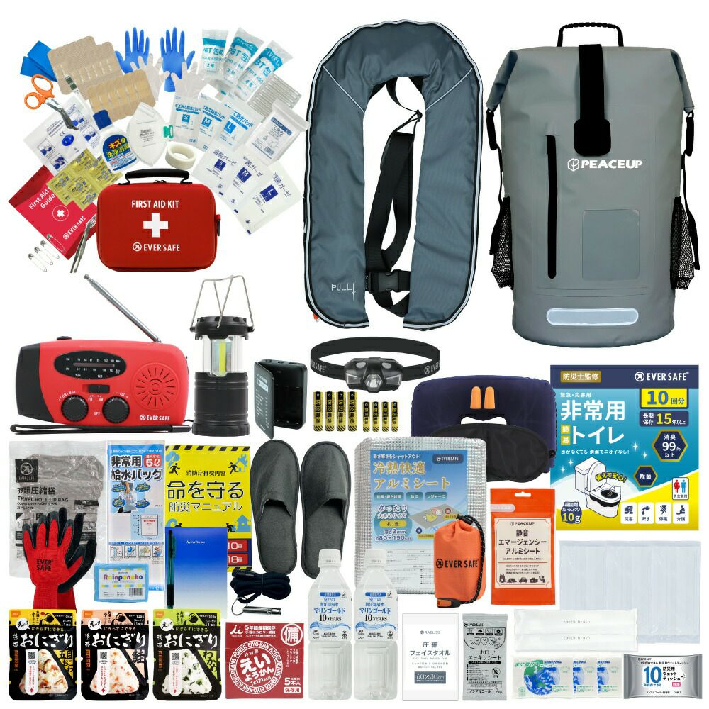 他の画像を見る ベストタイプのライフジャケット付き 水害に備える防災セット 水に強い防水リュック 防災士監修 防災セット 1人用 ドライバッグ 防水リュック 手動膨張式 ライフジャケット 水害対策 防災グッズ 非常食 保存水 ランタン 簡易トイレ 救急ポーチ 水難 アウトドア 警戒レベル3 PEACEUP L3DRLF01 公式サイト特別価格 ¥ 15,181 税込 詳細を見る お気に入りに登録する