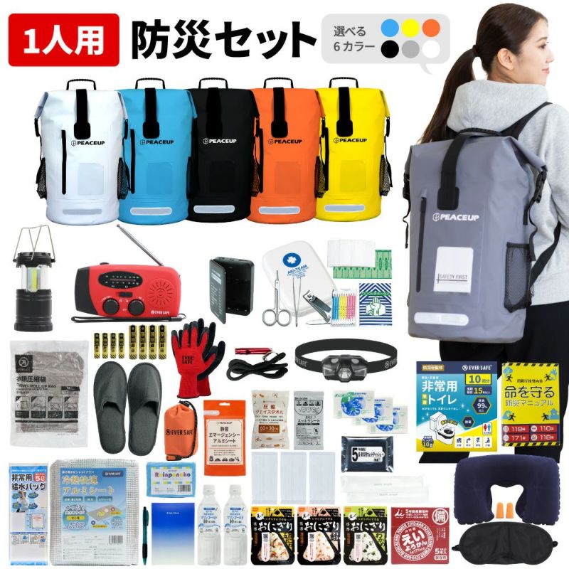 | 防災リュック | 1 | アウトドア・災害時に! 高い防水性、携帯性を備え、シンプルな作りで最大限の収納力を発揮。 ドライバッグはアウトドアや防災用のリュックに最適です。 水をためたり枕にしたりできるので非常時の使用方法にも適しています。 サイズ:(約)500 × 300mm マチ:Φ280mm 本体重量:(約)980g 容量:約35L 材質:500D tarpaulin 防水機能:IPX7 |