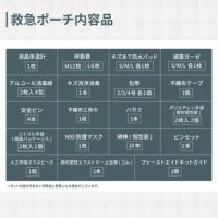 ファーストエイドケース (Lサイズ)×1 / 液晶体温計×1 / N95防護マスク×1 / キズ洗浄消毒×1 / 絆創膏 (Mサイズ)×12 / 絆創膏 (Lサイズ)×6 / キズあて防水パッド (S/M/L)×各1 / 滅菌ガーゼ (S/M/L)×各1 / アルコール消毒綿×4 / ハサミ×1 / ピンセット×1 /包帯 (2号/3号/4号)×各1 / 不織布三角巾×1 / 綿棒 (個包装)×10 / ニトリル手袋 (個装パッケージ入)×1 / ポリエチレン手袋 (密封個包装)×2 / 不織布テープ×1 / 安全ピン×4 / 熱可塑性エラストマー 止血帯 (ゴム) ×1 / 人工呼吸マウスピース×1 / ファーストエイドキットガイド×1 |