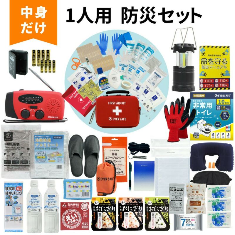 ファーストエイドケース (Lサイズ)×1 / 液晶体温計×1 / N95防護マスク×1 / キズ洗浄消毒×1 / 絆創膏 (Mサイズ)×12 / 絆創膏 (Lサイズ)×6 / キズあて防水パッド (S/M/L)×各1 / 滅菌ガーゼ (S/M/L)×各1 / アルコール消毒綿×4 / ハサミ×1 / ピンセット×1 /包帯 (2号/3号/4号)×各1 / 不織布三角巾×1 / 綿棒 (個包装)×10 / ニトリル手袋 (個装パッケージ入)×1 / ポリエチレン手袋 (密封個包装)×2 / 不織布テープ×1 / 安全ピン×4 / 熱可塑性エラストマー 止血帯 (ゴム) ×1 / 人工呼吸マウスピース×1 / ファーストエイドキットガイド×1