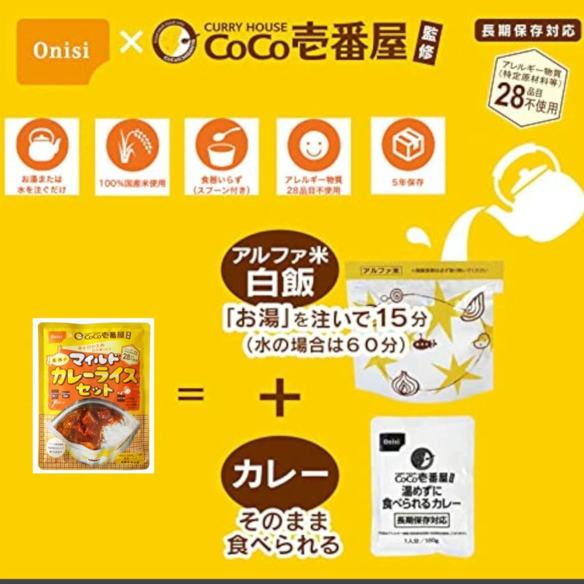 他の画像を見る アレルギー対応食 食器不要/スプーン付 非常食セット CoCo壱番屋監修 尾西のマイルドカレーライスセット 30食セット 5年保存食 公式サイト販売価格 ¥ 18,714 税込 詳細を見る お気に入りに登録する