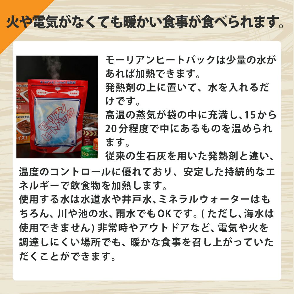 他の画像を見る ガスも電気も使わずにご飯を温める!アルファ米や缶詰等の保存食も温められます。 【メール便OK(2セットまで)】モーリアンヒートパック Mサイズ・加熱袋 1個 + 発熱剤 3個セット 公式サイト販売価格 ¥ 552 税込 詳細を見る お気に入りに登録する
