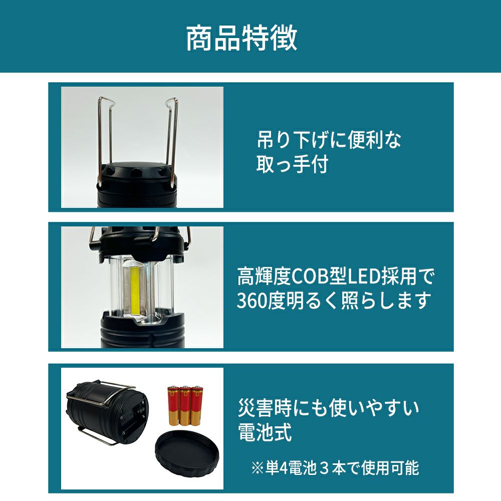 他の画像を見る 全方向360度明るく照らす 伸縮式小型COB LEDランタン 持ち運び 小型ランタン ミニLEDランタン ブラック 単品 防災用品 アウトドア 小型 明るい 電池式 COB ESLT02 EVERSAFE 公式サイト特別価格 ¥ 645 税込 詳細を見る お気に入りに登録する