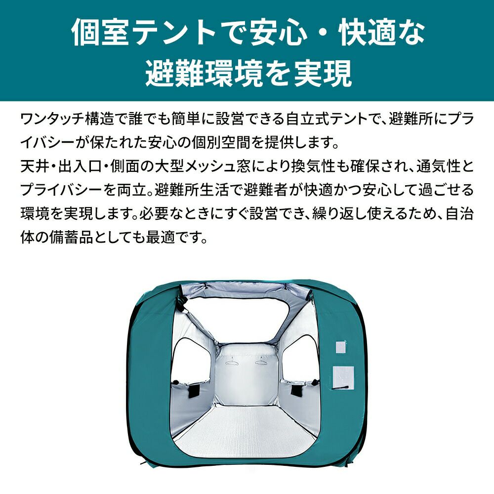 他の画像を見る プライバシーと通気性を両立した、安心できる避難所空間の実現 避難所での快適な生活を支える、使いやすく機能的な設計 防災用 避難個室テント 180 4個 防災グッズ シェルターテント プライバシー ファミリー 大型 軽量 パーティション 災害時 避難所 屋内 屋外 持ち運び コンパクト 抗菌 防水 UVカット 寒さ対策 車椅子 KO395 RABLISS 公式サイト特別価格 ¥ 129,580 税込 詳細を見る お気に入りに登録する