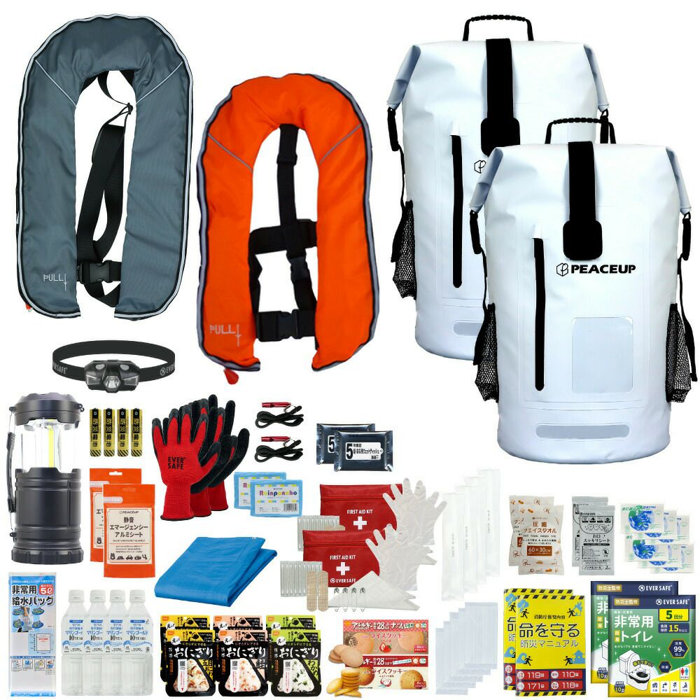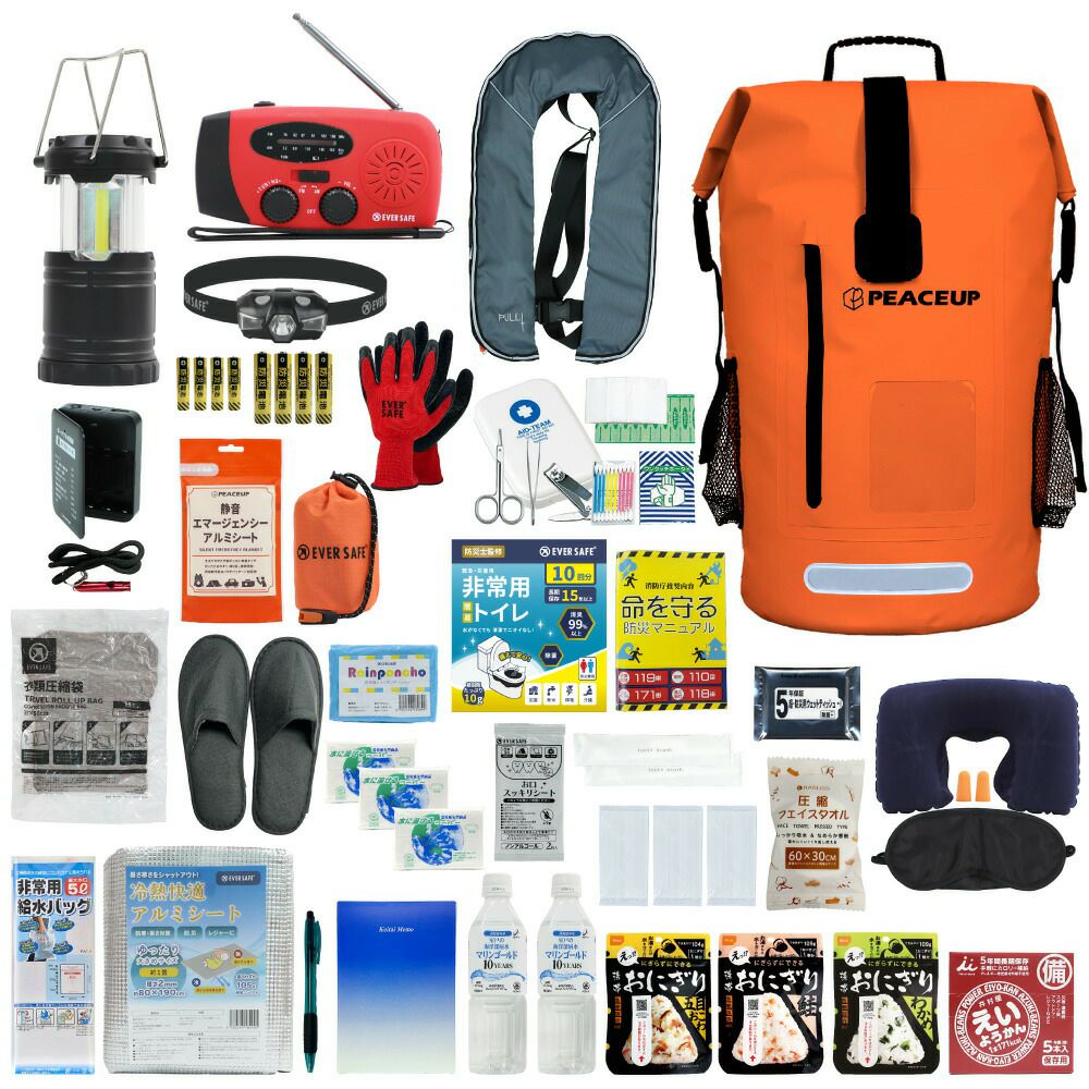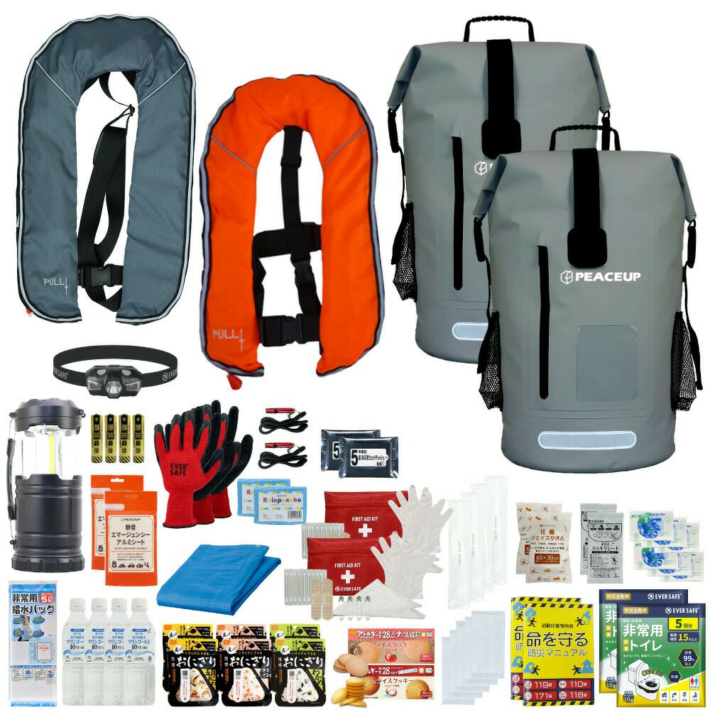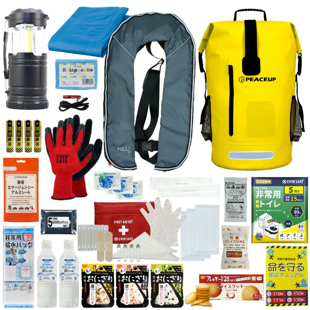 他の画像を見る ベストタイプのライフジャケット付き 水害に備える防災セット 水に強い防水リュック 防災士監修 防災セット 2人用 ドライバッグ 防水リュック 手動膨張式 ライフジャケット 水害対策 防災グッズ 非常食 保存水 ランタン 簡易トイレ 救急ポーチ 水難 アウトドア 警戒レベル3 PEACEUP L3DRLF02 公式サイト販売価格 ¥ 27,074 税込 詳細を見る お気に入りに登録する