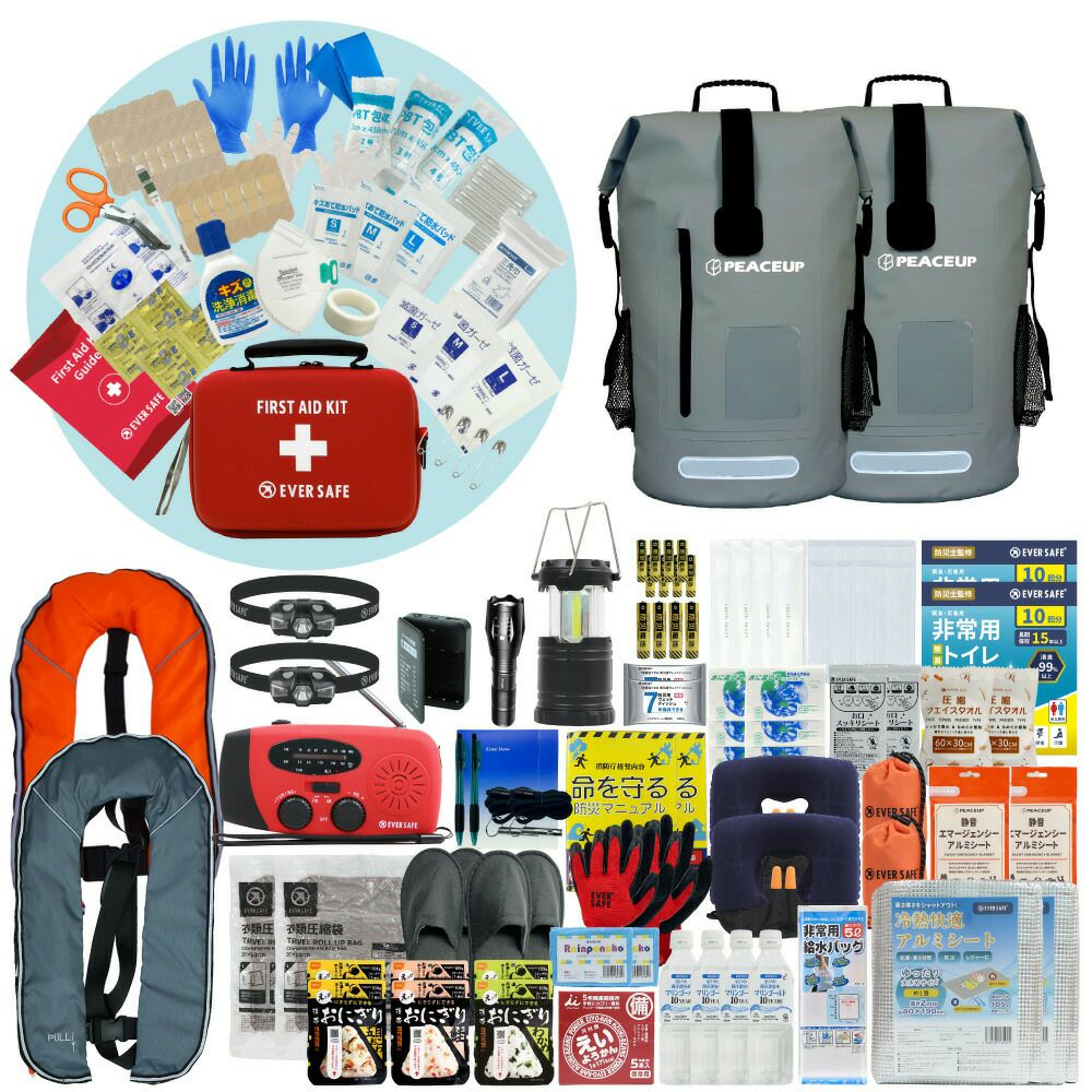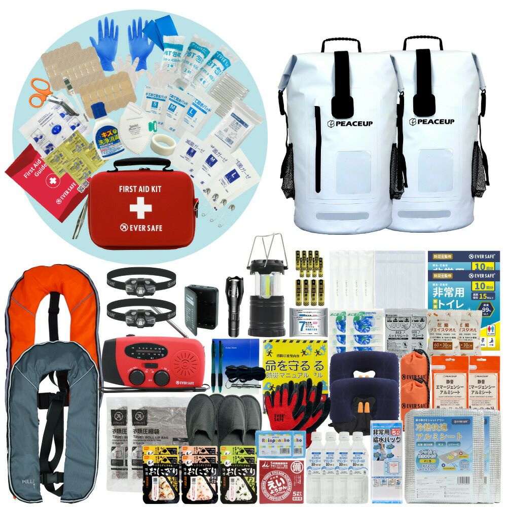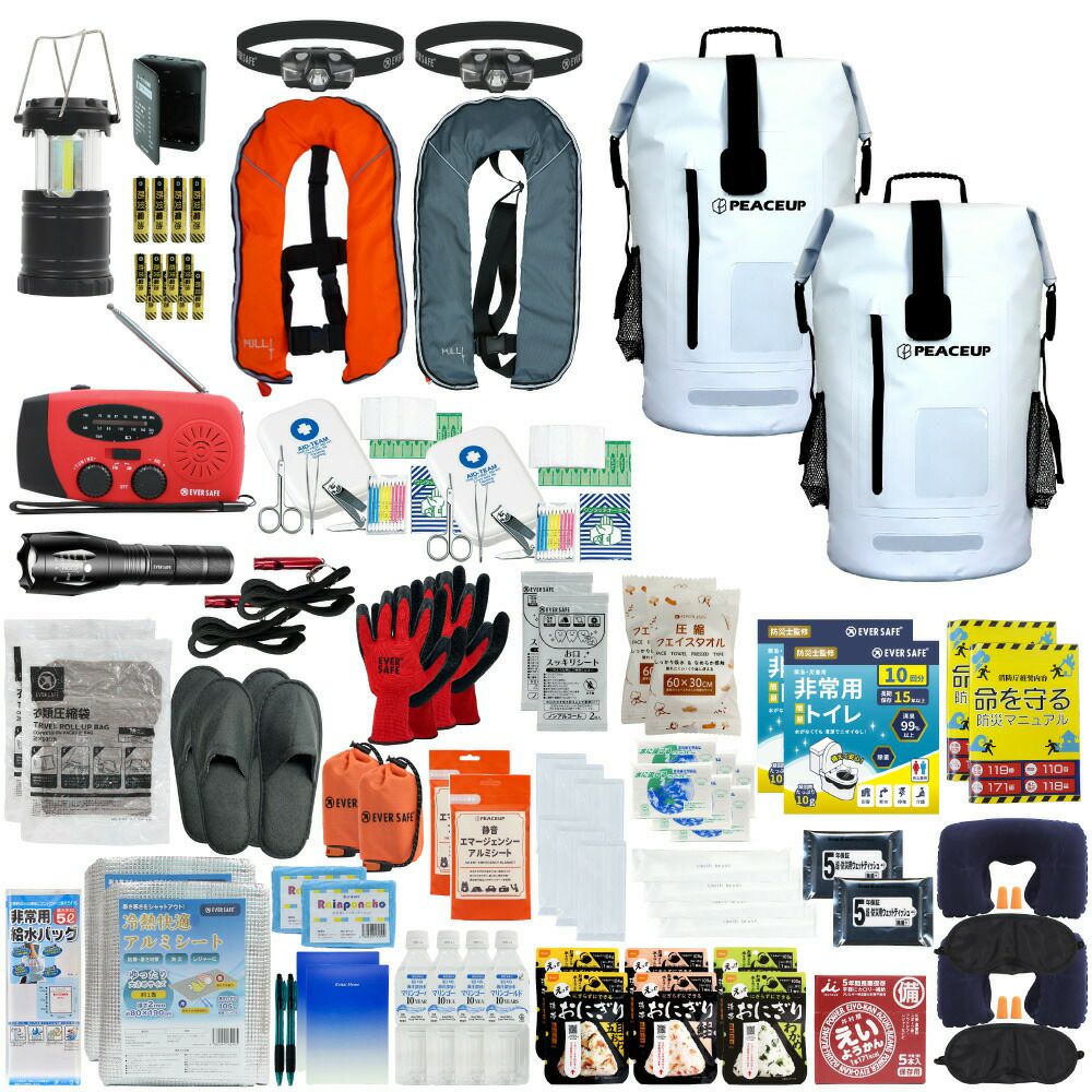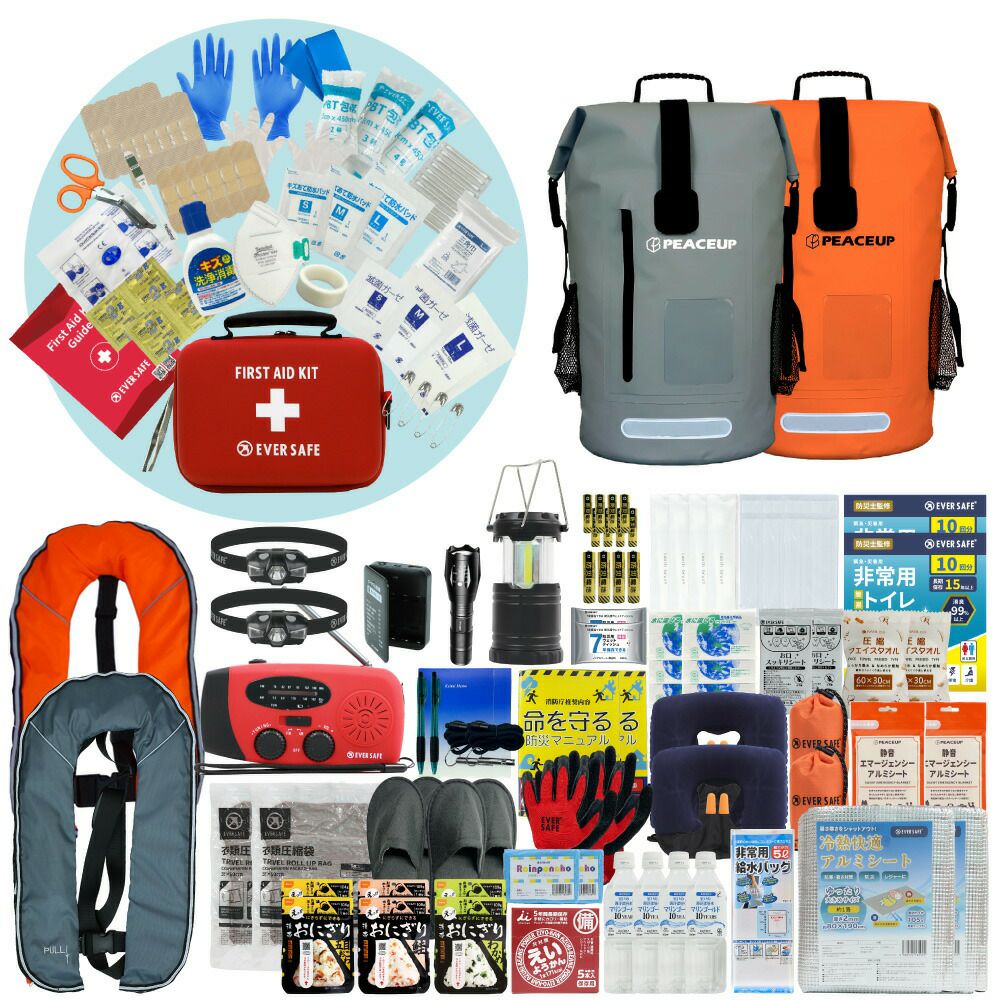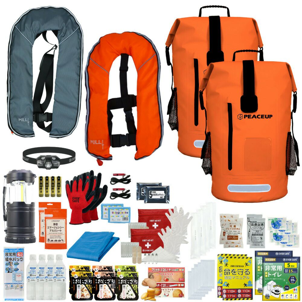 他の画像を見る ベストタイプのライフジャケット付き 水害に備える防災セット 水に強い防水リュック 防災士監修 防災セット 2人用 ドライバッグ 防水リュック 手動膨張式 ライフジャケット 水害対策 防災グッズ 非常食 保存水 ランタン 簡易トイレ 救急ポーチ 水難 アウトドア 警戒レベル3 PEACEUP L3DRLF02 公式サイト販売価格 ¥ 27,074 税込 詳細を見る お気に入りに登録する