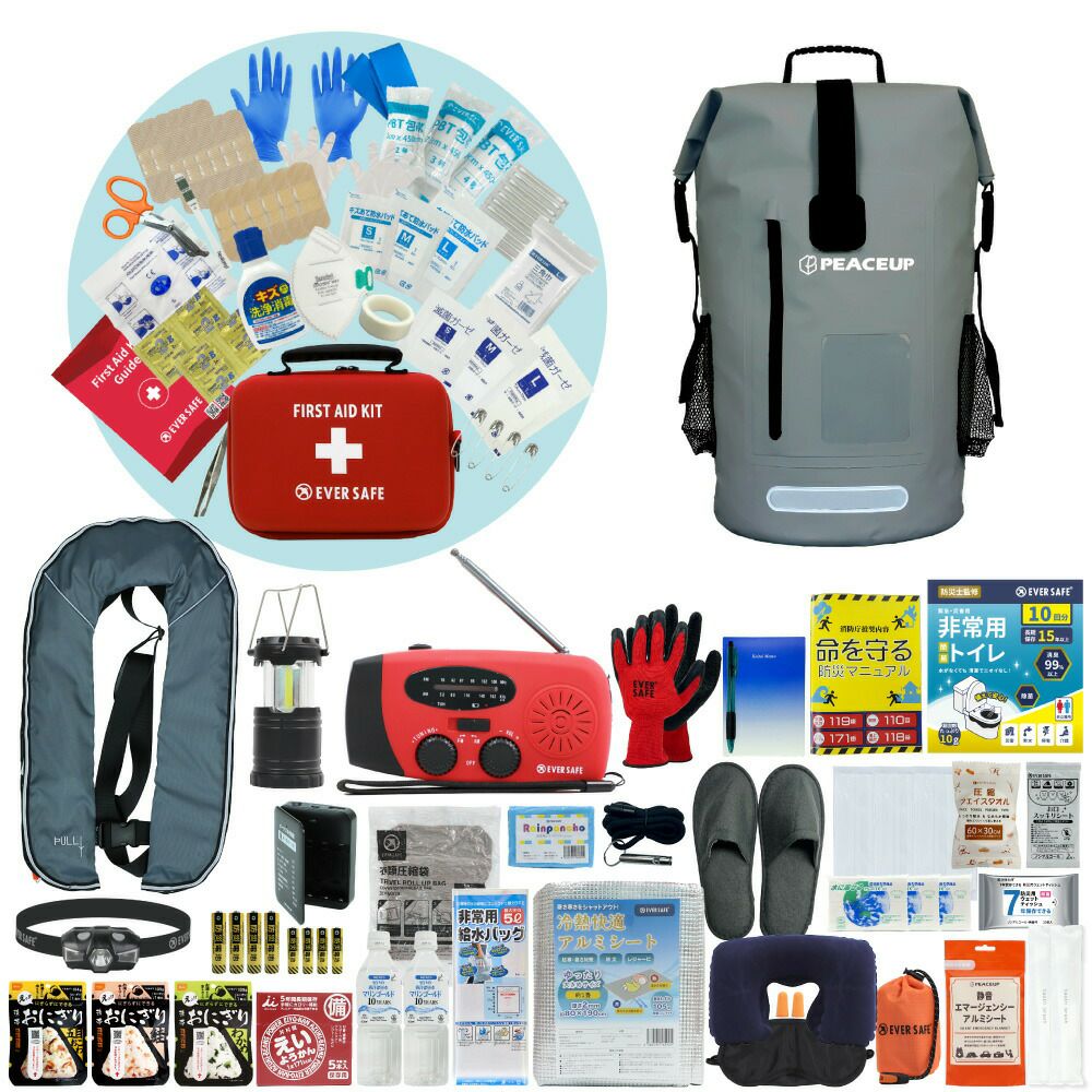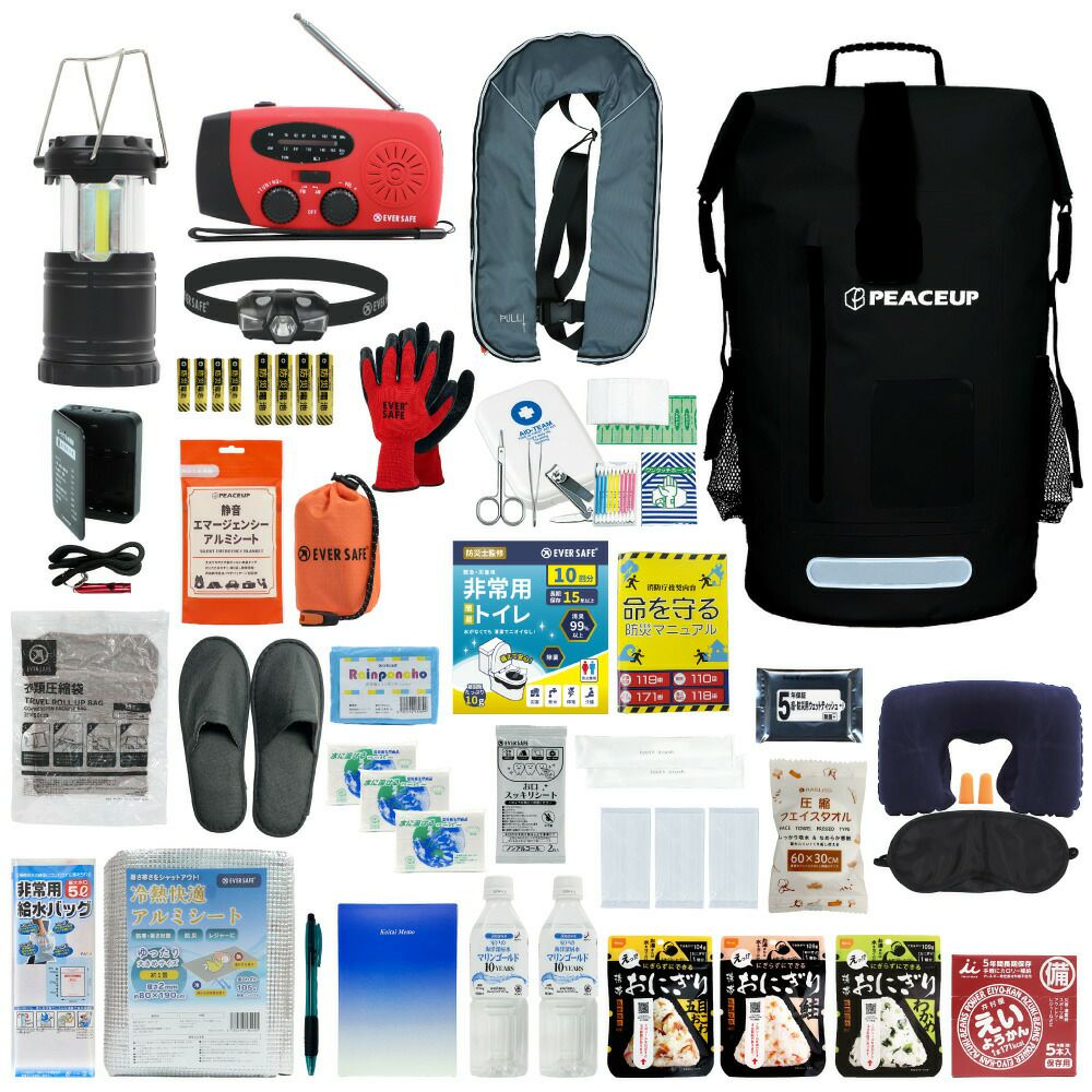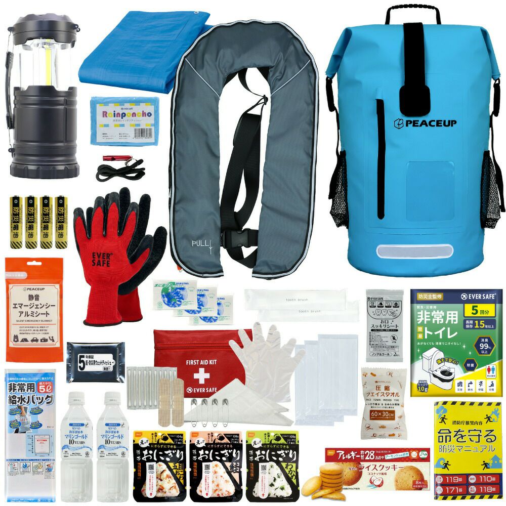 他の画像を見る ベストタイプのライフジャケット付き 水害に備える防災セット 水に強い防水リュック 防災士監修 防災セット 1人用 ドライバッグ 防水リュック 手動膨張式 ライフジャケット 水害対策 防災グッズ 非常食 保存水 ランタン 簡易トイレ 救急ポーチ 水難 アウトドア 警戒レベル3 PEACEUP L3DRLF01 公式サイト販売価格 ¥ 15,181 税込 詳細を見る お気に入りに登録する