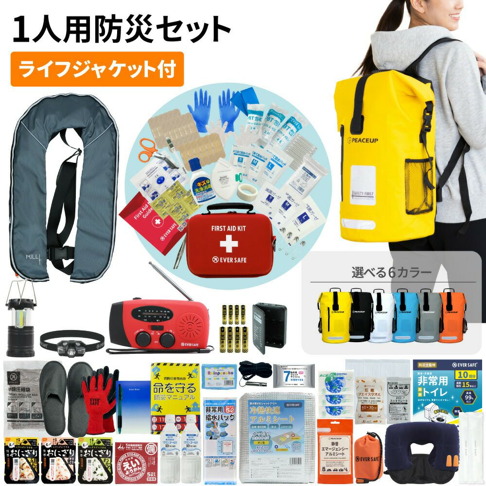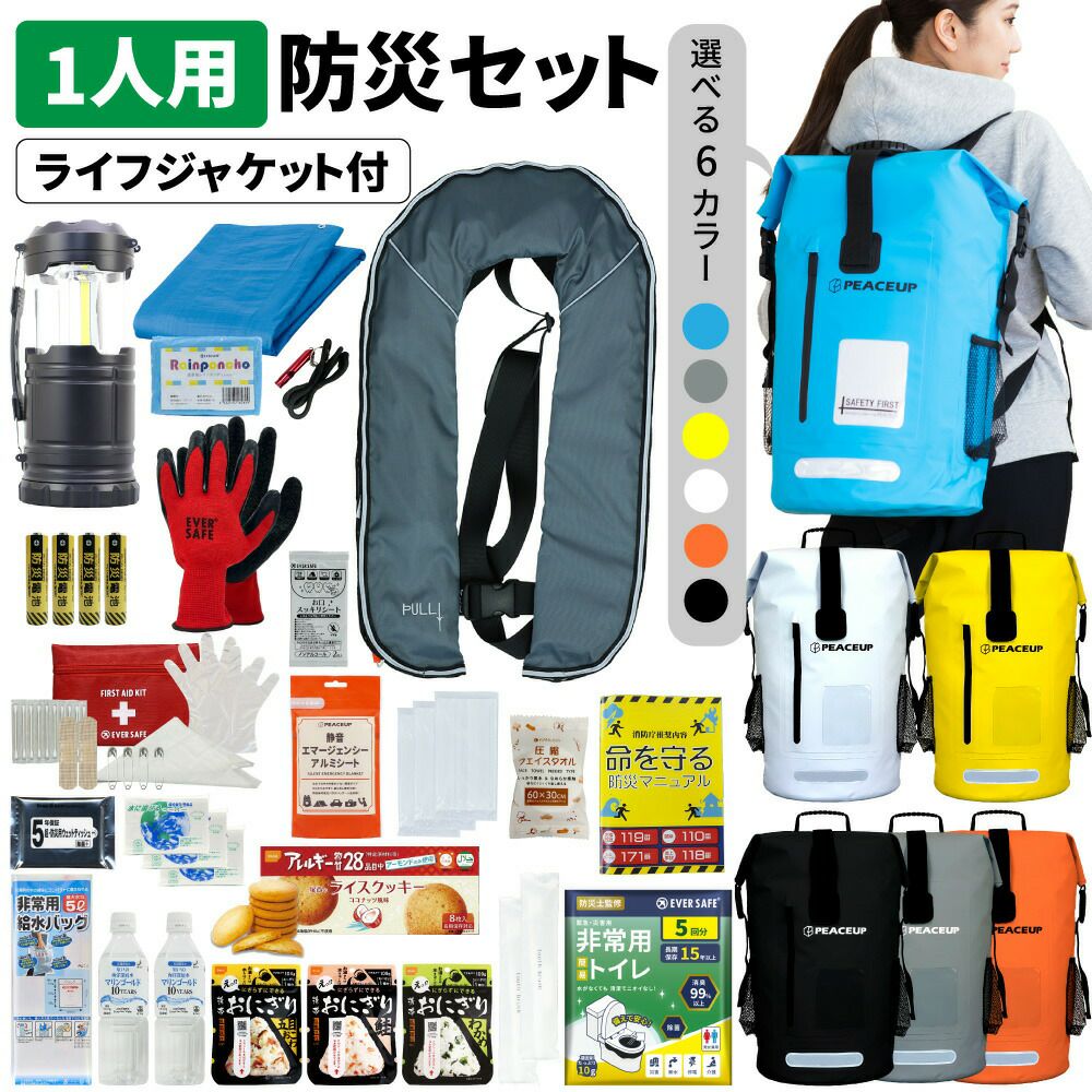 他の画像を見る 水に強い防水リュック ライフジャケット付き 水害に備える防災セット 選べる6カラー 防災士監修 防災セット 1人用 ドライバッグ 防水リュック 手動膨張式 ライフジャケット ヘッドライト 水害対策 防災リュック 非常食 保存水 防災ラジオ 簡易トイレ 懐中電灯 警戒レベル4 水難 アウトドア L4DRLF01 公式サイト販売価格 ¥ 22,610 税込 詳細を見る お気に入りに登録する