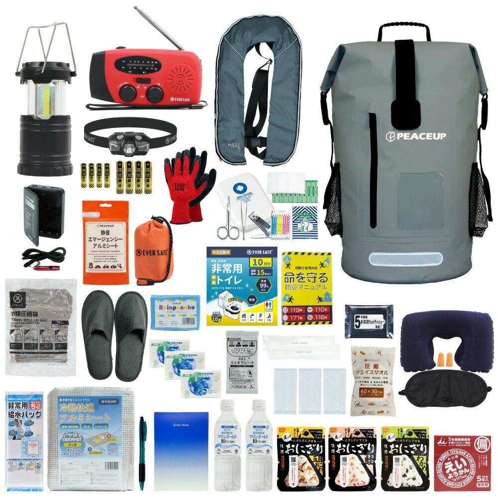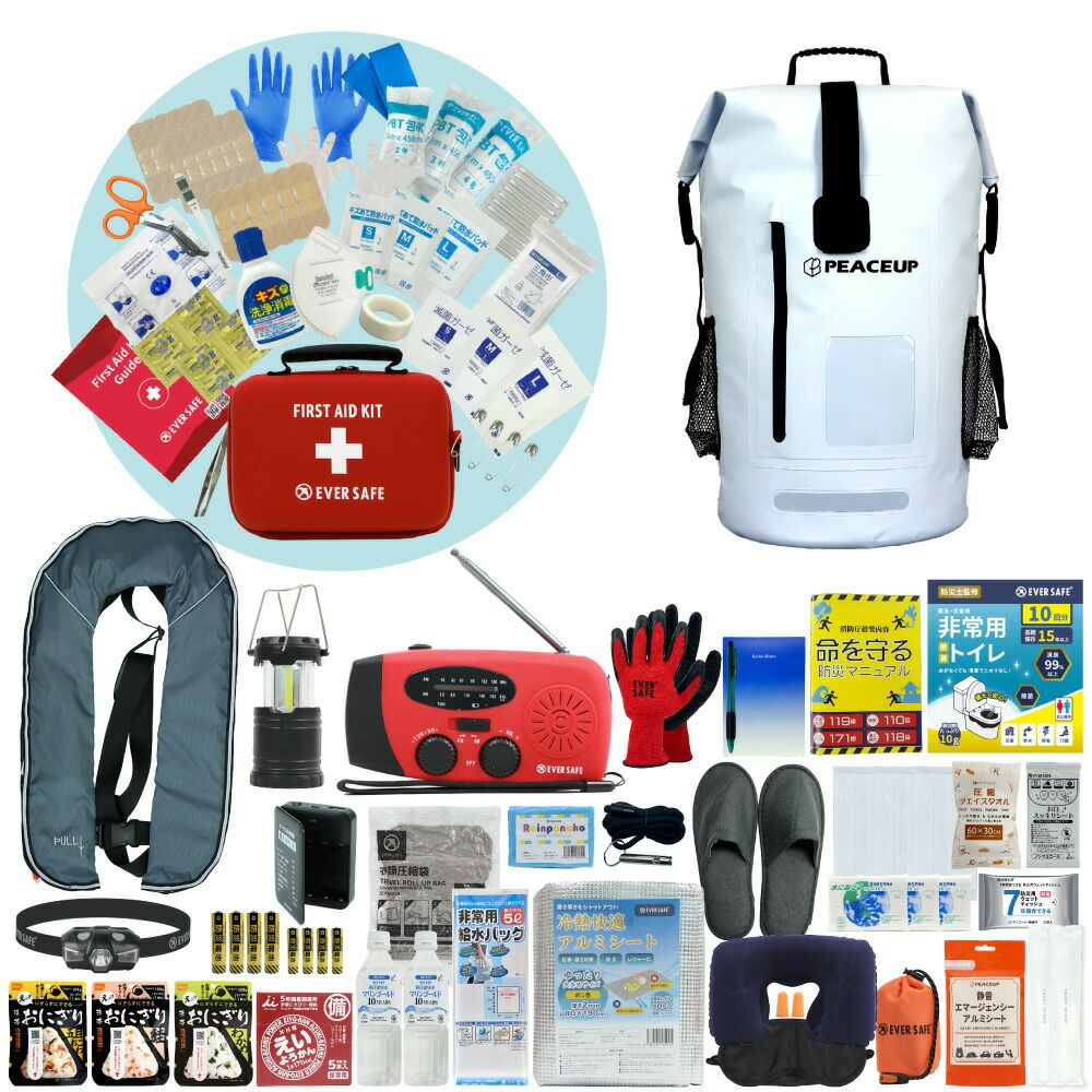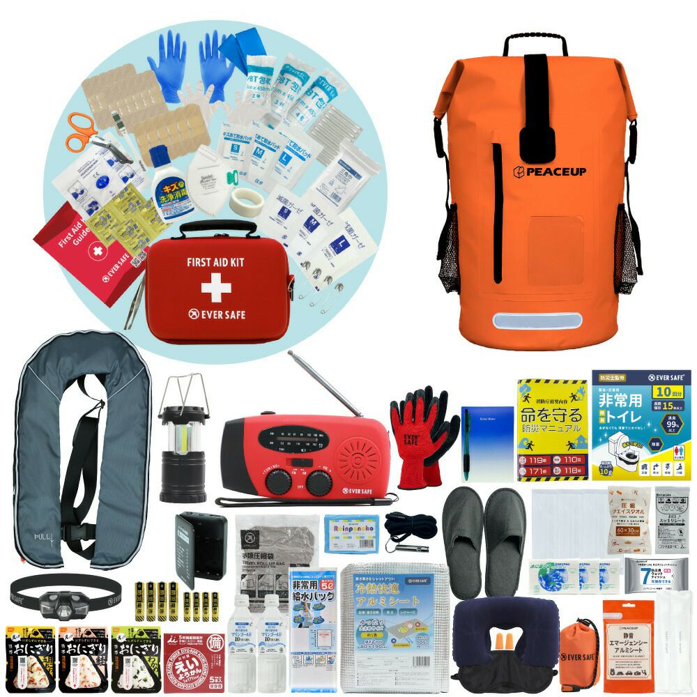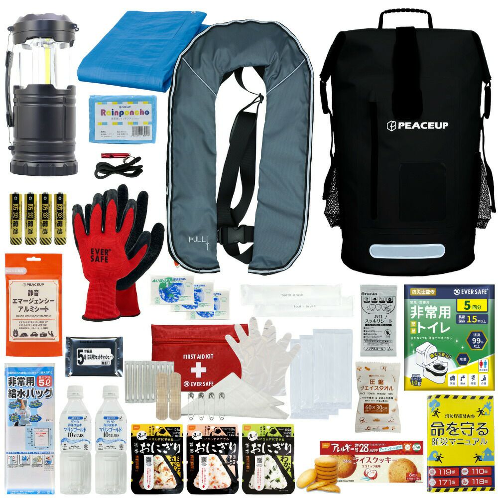 他の画像を見る ベストタイプのライフジャケット付き 水害に備える防災セット 水に強い防水リュック 防災士監修 防災セット 1人用 ドライバッグ 防水リュック 手動膨張式 ライフジャケット 水害対策 防災グッズ 非常食 保存水 ランタン 簡易トイレ 救急ポーチ 水難 アウトドア 警戒レベル3 PEACEUP L3DRLF01 公式サイト販売価格 ¥ 15,181 税込 詳細を見る お気に入りに登録する