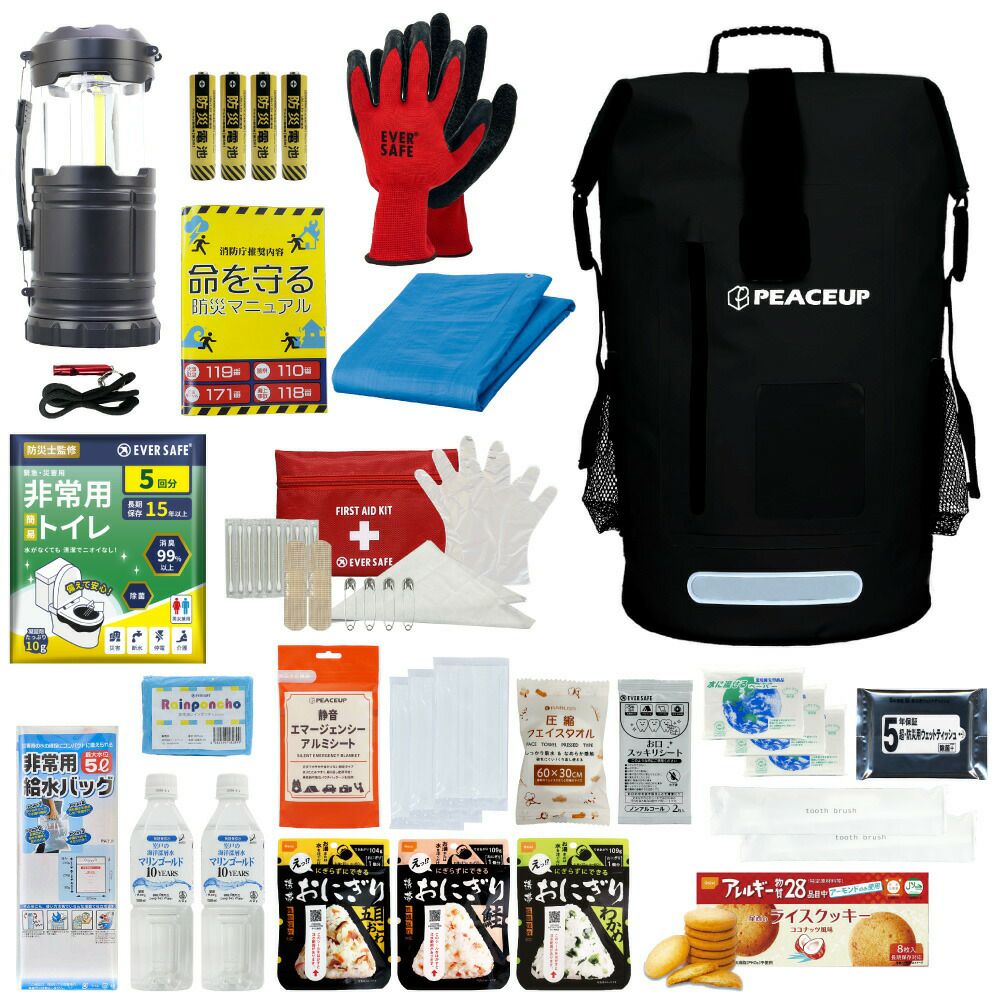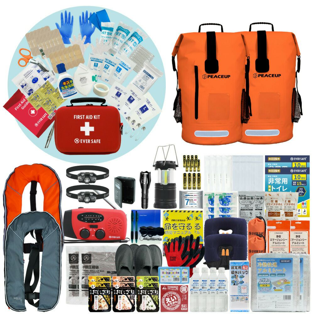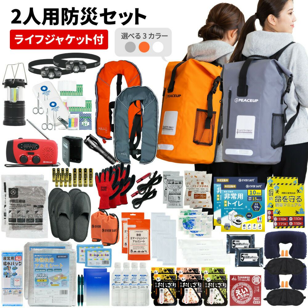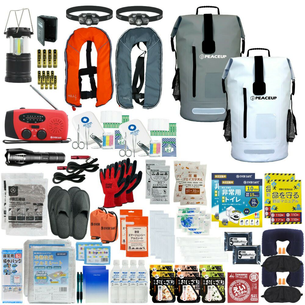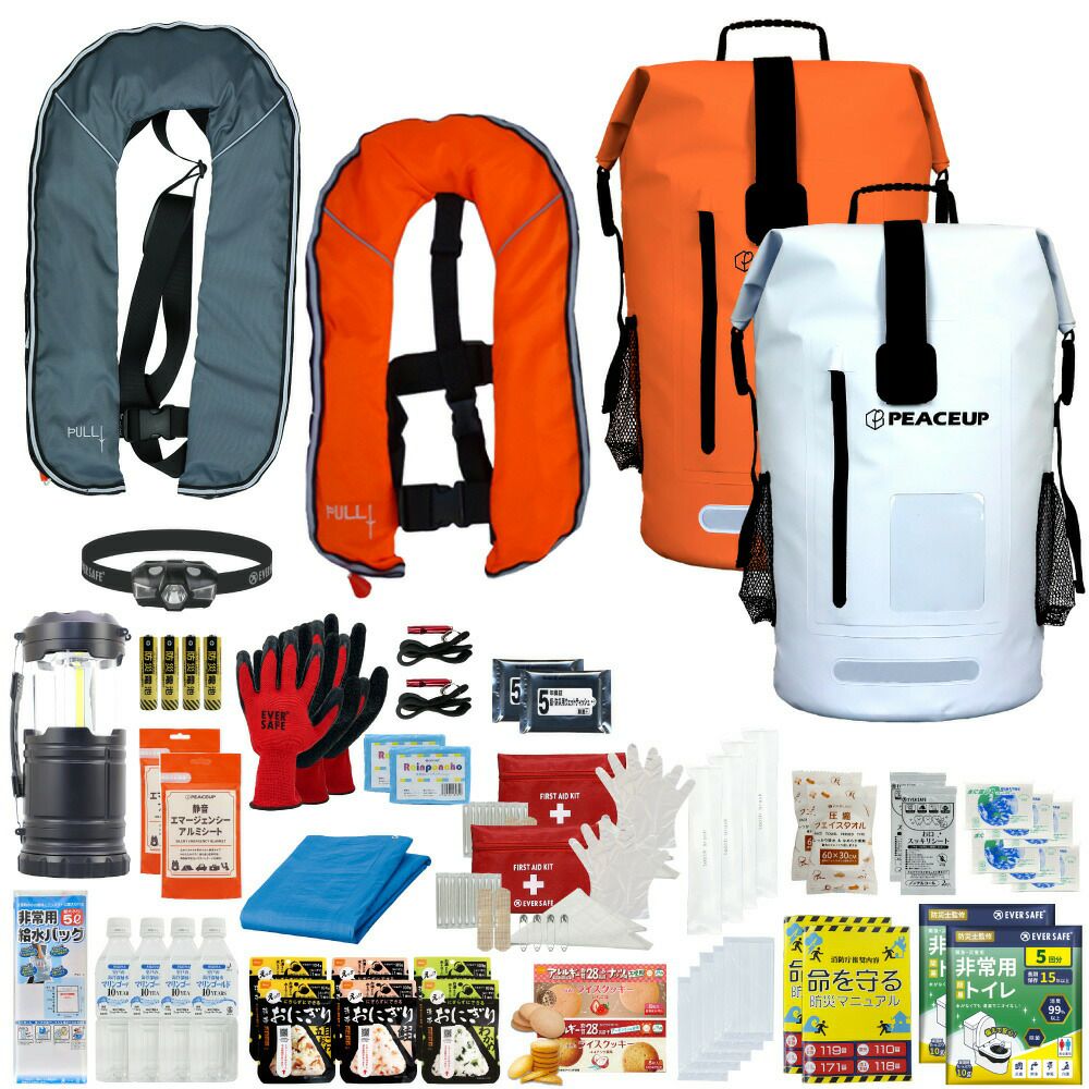 他の画像を見る ベストタイプのライフジャケット付き 水害に備える防災セット 水に強い防水リュック 防災士監修 防災セット 2人用 ドライバッグ 防水リュック 手動膨張式 ライフジャケット 水害対策 防災グッズ 非常食 保存水 ランタン 簡易トイレ 救急ポーチ 水難 アウトドア 警戒レベル3 PEACEUP L3DRLF02 公式サイト販売価格 ¥ 27,074 税込 詳細を見る お気に入りに登録する