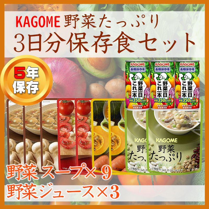 他の画像を見る 化学調味料無添加!KAGOMEの常温でもおいしいレトルトパウチ非常食 カゴメの野菜たっぷり3日分保存食セットカゴメ野菜一日これ一本 公式サイト販売価格 ¥ 3,531 税込 詳細を見る お気に入りに登録する