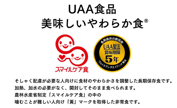 他の画像を見る 歯ぐきでつぶせる 農林水産省制定「スマイルケア食」噛むことが難しい人向け「黄」マーク取得 根菜のやわらか煮 5年保存食 50袋/箱 そしゃく配慮 美味しいやわらか食 非常食 UAA食品 そのまま食べられる長期保存食 公式サイト販売価格 ¥ 22,777 税込 詳細を見る お気に入りに登録する
