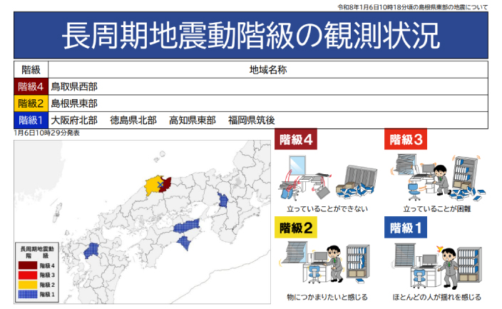 この地震では、震源から離れた地域でも長周期地震動が観測されました。気象庁の発表では、鳥取県西部で最も強い「長周期地震動 階級4」を記録したほか、大阪府北部でも「階級1」を観測しています。大阪市内でも、高層ビルを中心に「ゆっくりとした揺れ」が顕著に現れました。