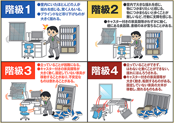| 階級4 | はわないと動けない。固定していない家具のほとんどが転倒・落下の危険。 |